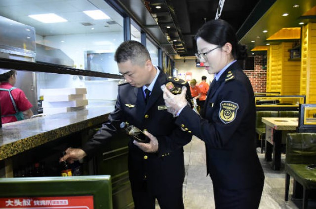 为进一步强化食品安全监管,切实保障消费者饮食安全,延吉市市场监管局不断强化执法检查,进一步规范“网红”餐饮单位经营行为。图为工作人员在进行执法检查。