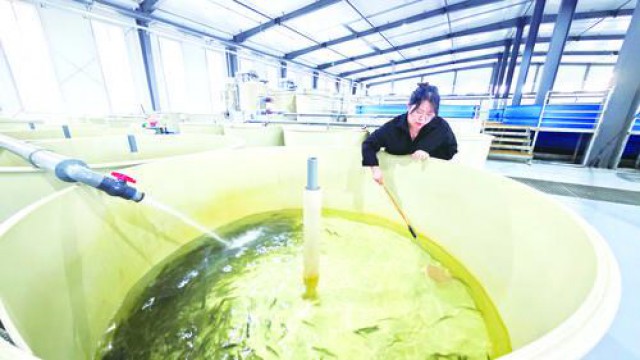 珲春市密江乡解放村冷水鱼养殖项目总投资3亿元,用地面积25万平方米,建设孵化能力1亿尾的大麻哈鱼扩繁增殖放流基地和100吨冷水鱼工厂化养殖基地(含大麻哈鱼展览体验馆)及文旅项目。该项目一期投资1900万元,已建成冷水鱼孵化车间,建筑面积4886平方米,年孵化量2000万尾。图为工作人员在孵化车间巡塘。