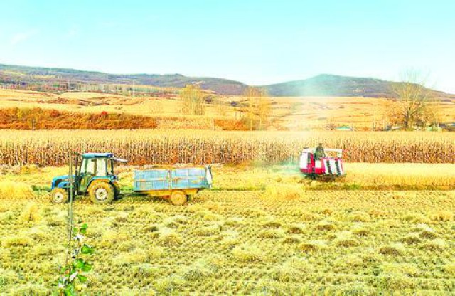 今年,延吉市水稻种植面积2500余公顷,水稻收割机保有量在120台以上,预计10月底前完成水稻收割。图为延吉市朝阳川镇长新村农民正在收割水稻。