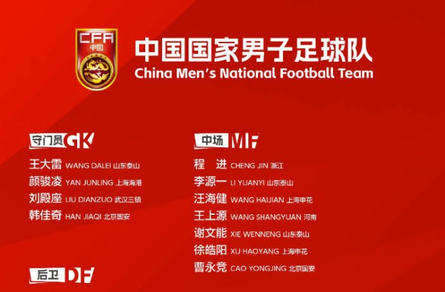 中场:谢文能(山东泰山)、李源一(山东泰山)、程进(浙江)、徐皓阳(上海申花)、汪海健(上海申花)、王上源(河南)