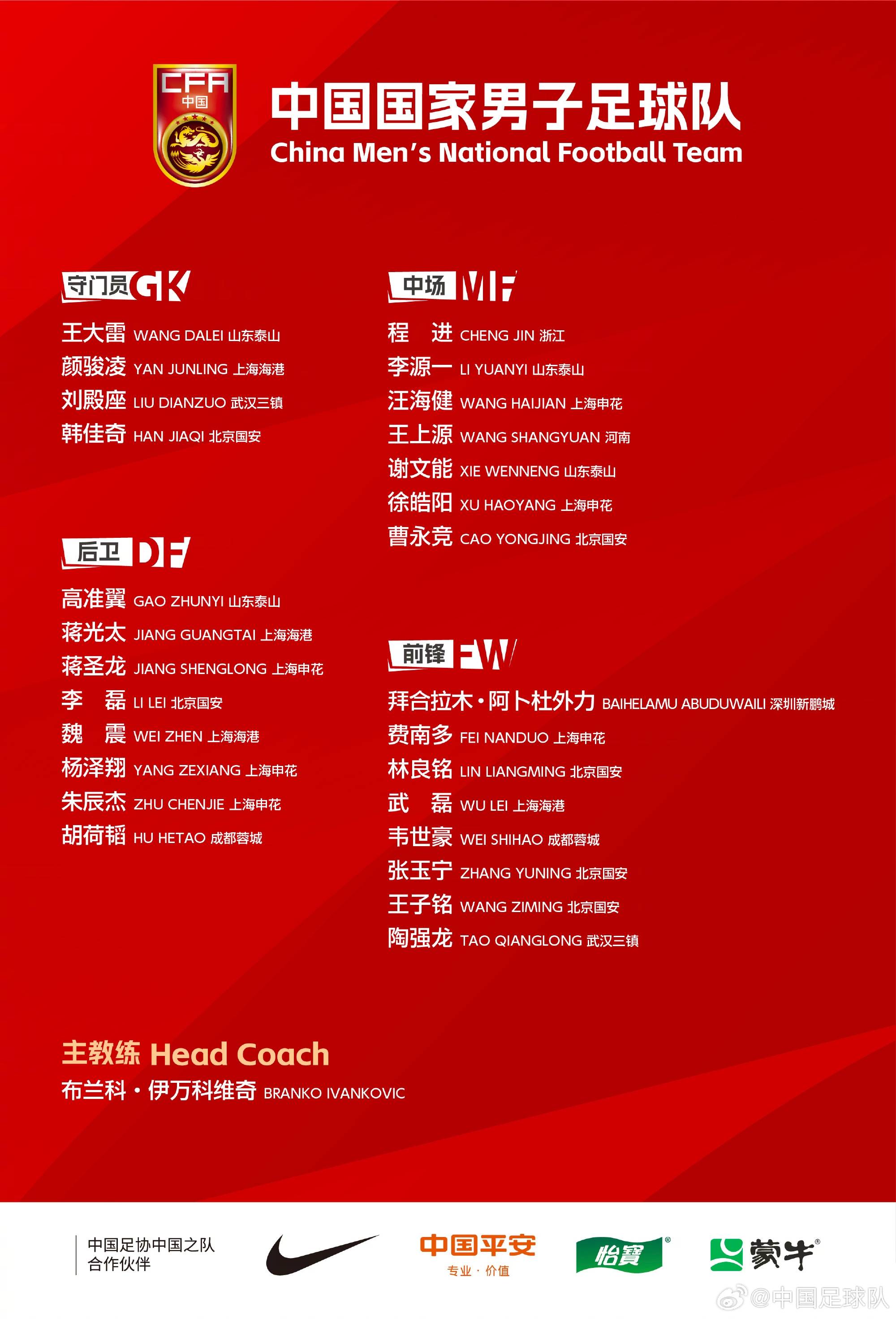 门将:颜骏凌(上海海港)、王大雷(山东泰山)、韩佳奇(北京国安)、刘殿座(武汉三镇)