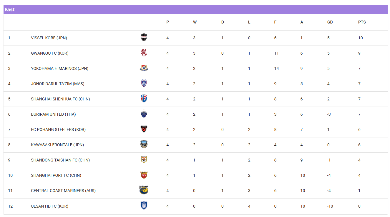 泰山队的比赛是三支中超球队中最晚进行的,可惜的是他们也在客场2-4输给了浦项制铁。泰山受困于人员不整,并且主帅崔康熙还被禁赛,比赛中高准翼与李源一又接连受伤,这让已经落后的泰山雪上加霜。积分榜上,泰山队以1胜1平2负积4分,进8球丢9球的成绩,排在第9名的位置,同样距离晋级区有2分之差。