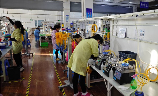 图们舜峰光电科技有限公司是省级“专精特新”中小企业,主要研究、生产、销售光纤通讯器件和设备,2018年迄今共创产值近1.1亿元。图为该公司生产车间。