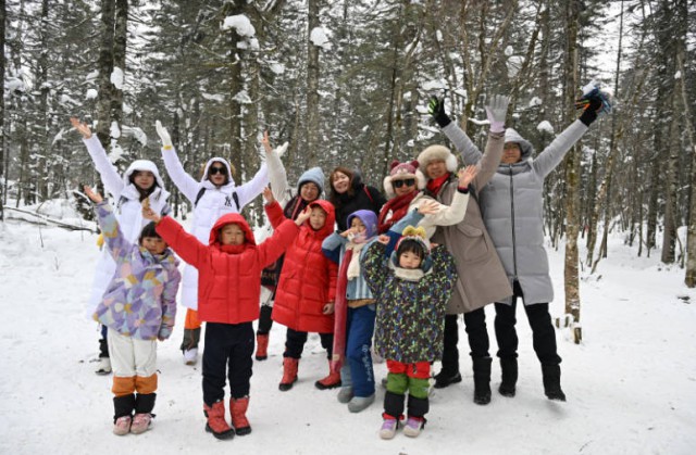 近日的几场降雪,让和龙市老里克景区披上“银装”,迎来最佳观雪季,天然雪雕与雾凇景观让人们仿佛置身于童话世界。图为来自杭州的游客在雪地中打卡拍照。