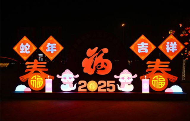 红彤彤的福字、可爱的卡通蛇宝宝、造型新颖的各类福字……延吉住建部门在市区内广场、主干道等设置多处主题景观小品,以红色为主色调,将生肖蛇、春联、福字、春字、红灯笼等传统中国元素融入景观小品中,营造出白天红起来、夜晚亮起来的喜庆氛围,让延吉大街小巷处处洋溢着欢乐祥和的节日氛围。