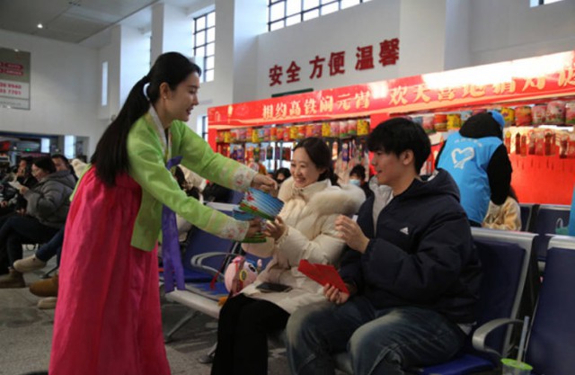 “在春运期间举办元宵节主题活动,旨在让南来北往的旅客在旅途中邂逅文化暖意。”图们北站党支部书记崔克介绍,今年春运期间,该站已开展了送福字、民俗表演等5场次文化活动。