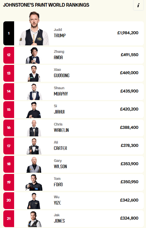 目前,共有5名中国选手跻身世界前16,创历史新高:丁俊晖(6)、赵心童(11)、张安达(12)、肖国栋(13)、斯佳辉(15)。