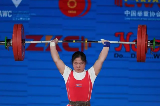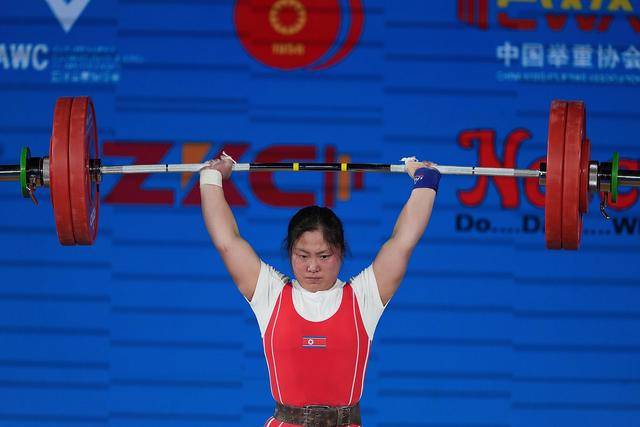 5月11日,朝鲜选手金日景在比赛中。最终,她获得抓举、挺举、总成绩三项冠军。