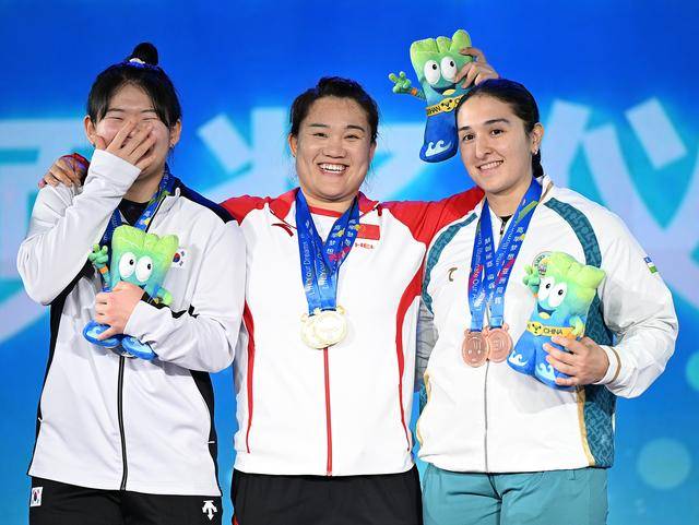 5月13日,总成绩冠军中国选手吴艳(中)、亚军韩国选手金伊瑟(左)和季军乌兹别克斯坦选手阿达什巴耶娃在颁奖仪式上。新华社记者 侯昭康 摄