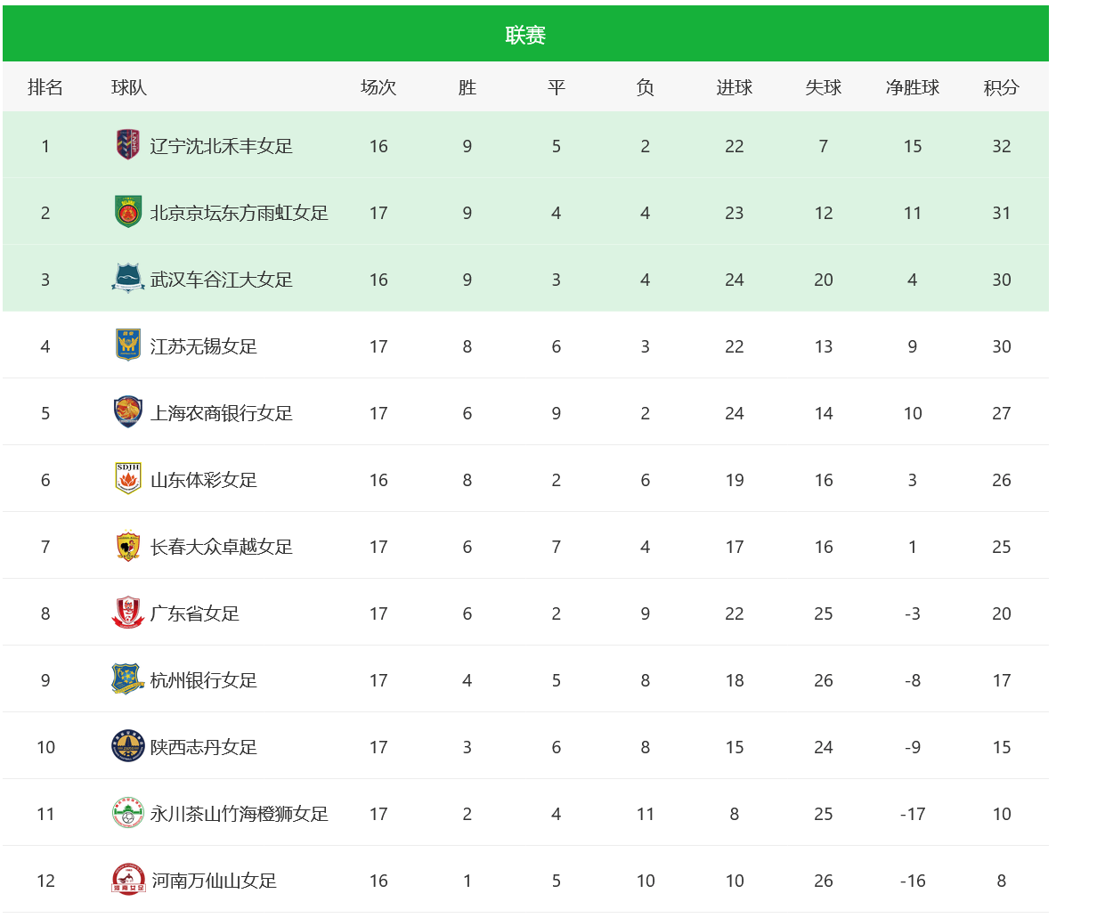 中女超联赛积分榜