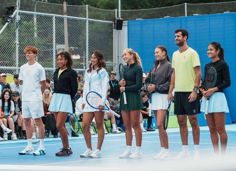 辛纳、大坂直美、郑钦文、安德烈耶娃、阿尼西莫娃、卡恰诺夫以及拉杜卡努(从左至右)在球迷活动现场。 新华社记者 肖亚卓 摄