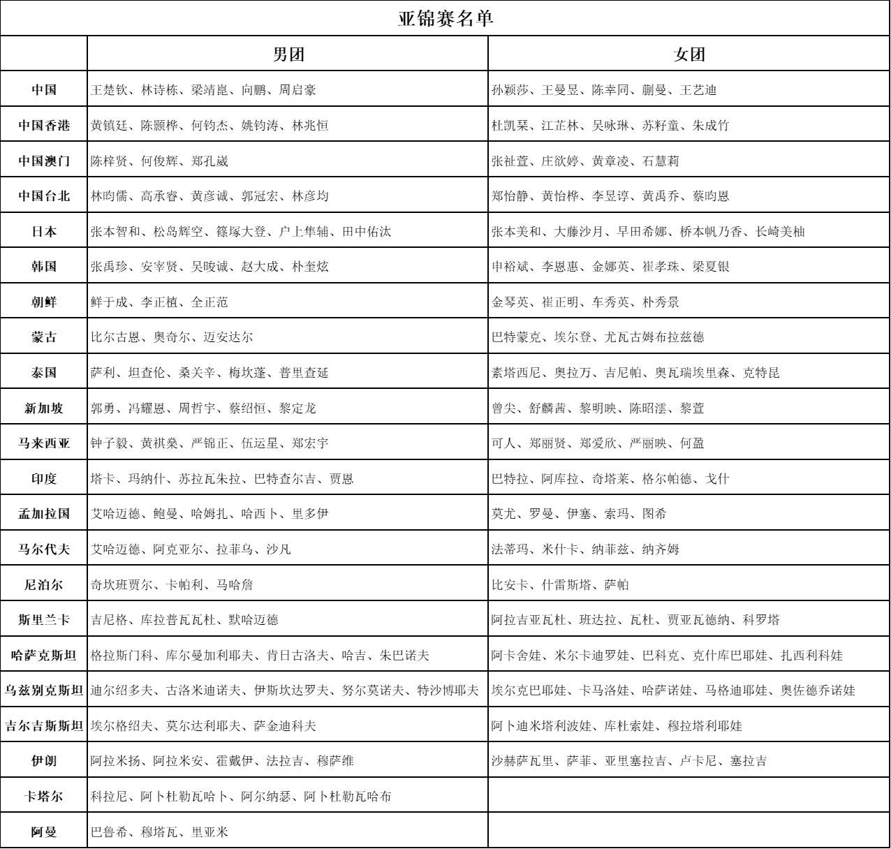 而在其他亚洲协会中,目前女团印度水平较高、泰国也具备一定实力,男团伊朗、新加坡、哈萨克斯坦存在爆冷可能,以下为最新报名情况: