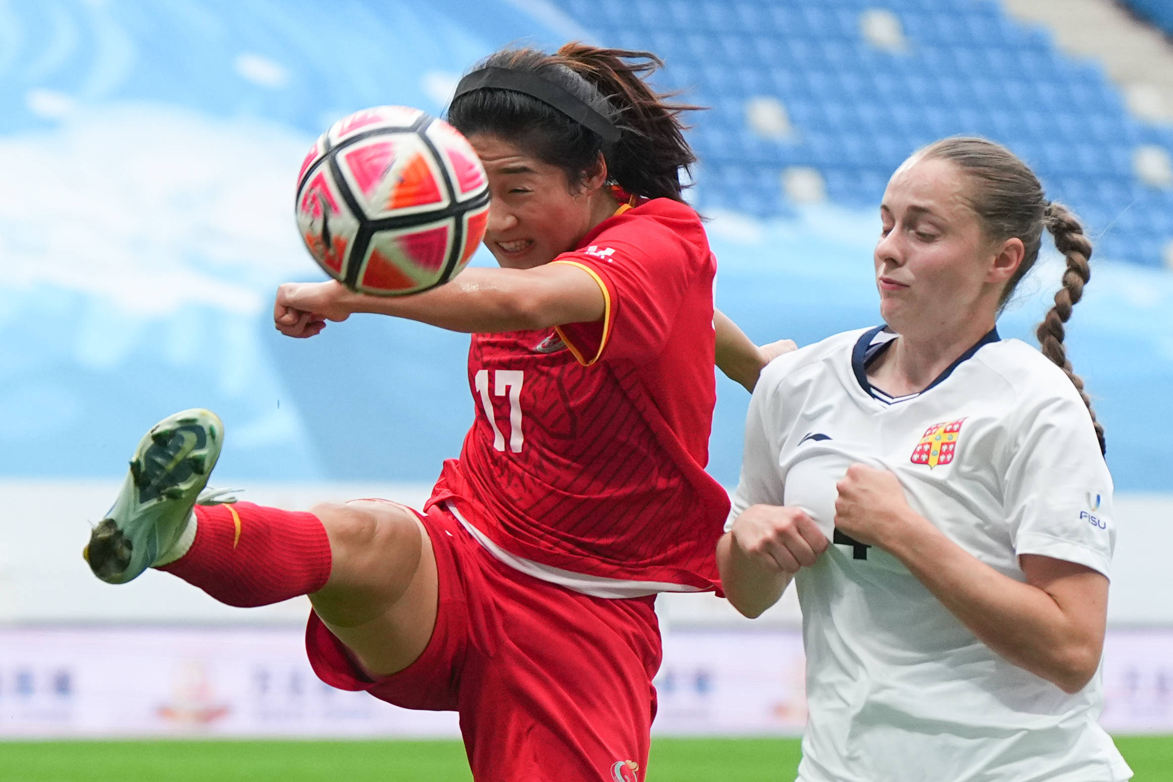 9月27日,上海体育大学女足球员李渟英格(左)在比赛中解围。 新华社记者 郑焕松 摄