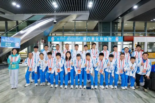 新华社照片,澳门,2025年11月4日 11月4日,浙江队在澳门国际机场合影。 当日,参加第十五届全国运动会乒乓球项目的各代表队陆续抵达澳门。 新华社发(张金加摄)
