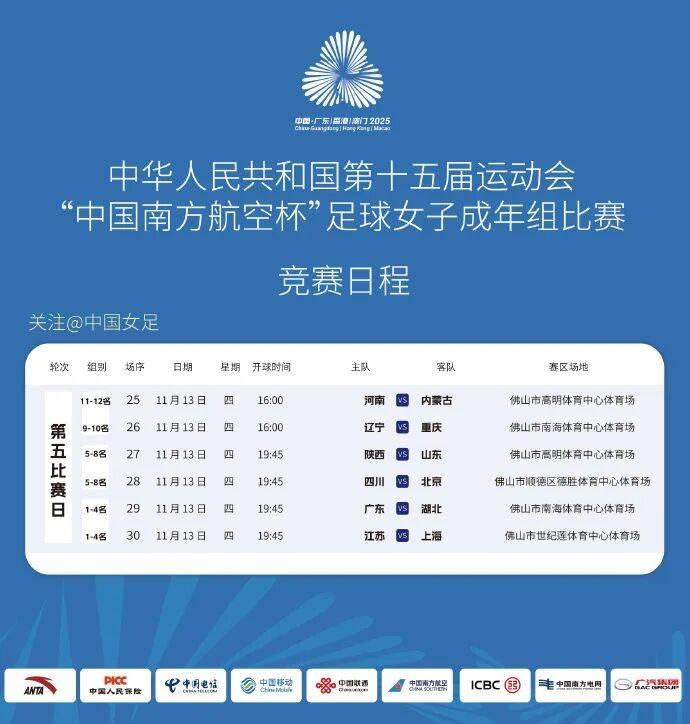 本届全运会女足成年组半决赛将同时在 13日19点45分打响, 广东队将在佛山南海体育中心迎战由女足国脚王霜领衔的湖北队,江苏队将与上海队在佛山世纪莲体育中心进行比赛。两场比赛的胜者将进入全运会女足成年组决赛,争夺最终的金牌。