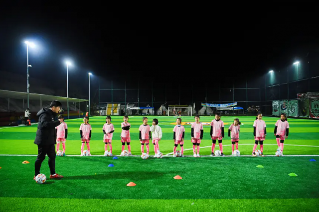 晚上7点,毕节七星关区的夜晚寒意正浓。但在海拔1700米的南山云端足球公园,灯光映照的绿茵场上一派热火朝天:21位身着粉色球衣的小女孩,正迎着凛冽山风进行带球、传球与体能训练。