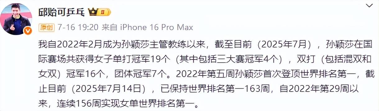 时间回溯到今年七月份,邱贻可在社媒发布长文,并详细罗列自接手孙颖莎以来取得的成就: