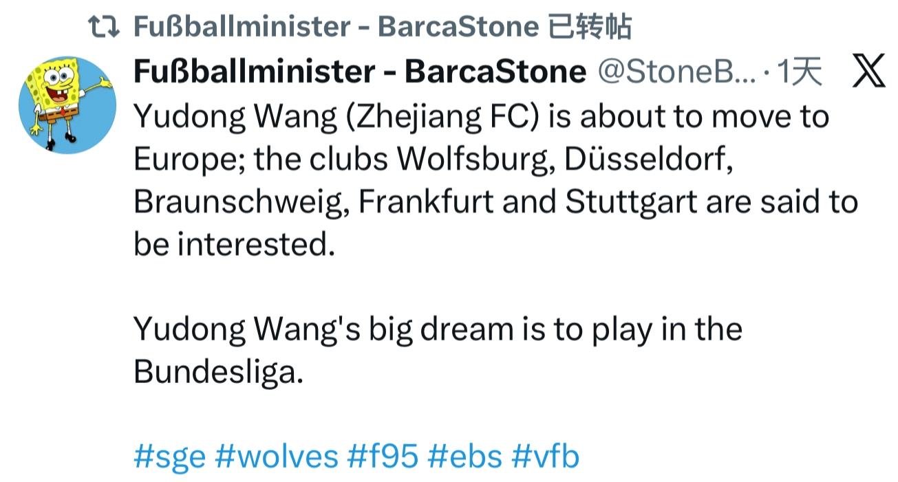 2025年12月31日,德国媒体报道,现在又有多支德国球队有意王钰栋,其中还包括斯图加特这样的德甲强队。据了解,浙江队球员、国足新星王钰栋再一次引起了欧洲球队的关注,现在有沃尔夫斯堡、法兰克福、斯图加特、布伦瑞克、杜塞尔多夫5家德国俱乐部有意引进王钰栋。沃、法、斯3支球队来自德甲,布、杜2支球队来自德乙,按报道来看,现在王钰栋似乎遇到了“多选难题”。