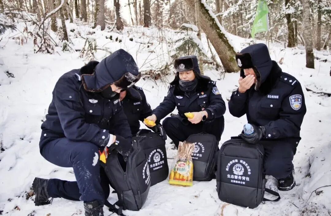 走进金苍林场辖区,这里海拔高、气温低,雪浅的地方没过膝盖,深的地方齐腰,巡护队员们深一脚浅一脚地前行。中午时分,风雪渐大,巡护队员在一处背风的山坳处短暂休息。大家拿出压缩饼干、面包和水,简单补充能量。“冬季巡护,吃饭从来都是凑合的,主要是以方便携带为主,顾不上口味。”民警们说笑着,手上却没闲着,正在整理上午的巡护记录。“下午我们还要去检查林区的防火设施,虽然雪天不容易起火,但万一用火不当,还是有风险。”一名林业干部笑着说。