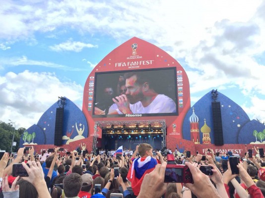 下午4点,大屏幕播放了身穿印有“俄罗斯”字样便装的国脚们,在志愿者列队中间走出的镜头,现场更加热闹了。俄罗斯队全体队员和主教练切尔切索夫出现在舞台上,现场出现了活动的第一场高潮。主持人开始介绍每个队员的名字,现场大屏幕也会播放球员踢球的画面,台下观众开始欢呼。随后主教练切尔切索夫和全体队员先后发言,对球迷表示感谢,说到动容处,台下有不少女球迷都感动得落泪了,这更像是喜悦和兴奋的泪水。发言过程中,前锋久巴和门将阿金费耶夫显然是最受俄罗斯球迷欢迎的球员,获得的欢呼和掌声也最多。