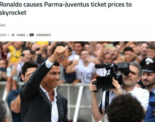 C罗加盟尤文使得整个意甲得益,众多球迷都翘首以盼可以亲眼见到C罗,而这也使得黄牛党们高兴了起来。来自《goal》的消息称,意甲新赛季第三轮帕尔马主场与尤文图斯的门票已经被炒高了六倍多,为了亲眼看见C罗,球迷需要花费178欧元。