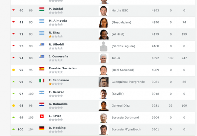 “clubworldranking”每周更新一次世界足球俱乐部排名、世界足球俱乐部教练排名和顶级射手排行榜,本期排名是2018年第33期排名。在教练排名方面,前皇家马德里主帅齐达内排名第1位。广州恒大主教练卡纳瓦罗的最新积分是3981分,在世界足球俱乐部教练排行榜上排名第96位,与上期排名相比提升1位。卡纳瓦罗的排名高于多位世界级名帅。拉涅利排名第180位。安切洛蒂排名第330位。卡纳瓦罗在意大利教练中排名第13位。上海上海上港主教练维托尔-佩雷拉的世界排名持续攀升,目前排名世界第121位。维托尔-佩雷拉的世界排名与上期相比提升4位。维托尔-佩雷拉的最新积分是3413分。贵州恒丰主教练佩特雷斯库的世界排名与上期相比下降10位。佩特雷斯库的最新世界排名是174位。佩特雷斯库的最新积分是2647分。天津权健主教练保罗-索萨的世界排名与上期相比提升4位。保罗-索萨的最新世界排名是第175位。保罗-索萨的最新积分是2642分。保罗-索萨下期排名可能会超过佩特雷斯库。北京中赫国安主教练施密特的世界排名与上期相比提升11位。施密特的最新世界排名是第181位。施密特的最新积分是2595分。