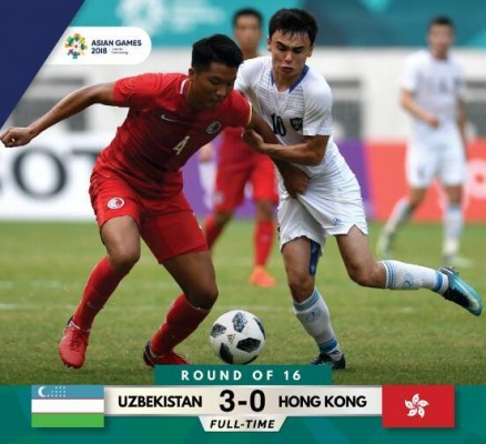 前亚运会男足冠军乌兹别克斯坦队3-0轻取中国香港队。第27分钟,中国香港队门将袁皓俊将乌兹别克斯坦开出的角球击出,阿里巴耶夫左肋得球横向带球,25米外右脚打出弧线球将球送到了球门右侧,乌兹别克斯坦1-0领先。第42分钟,中国香港队的余沛康被红牌驱逐,使得乌兹别克斯坦队占据人数优势。第60分钟,袁皓俊将乌兹别克斯坦的外围射门封出,哈姆达莫夫右侧得球底线前回敲,西迪科夫8米处推射破门,2-0。第65分钟,哈姆达莫夫右侧接任意球头球回顶,乌林博耶夫小禁区边缘鱼跃冲顶建功,将最终比分定格在3-0。