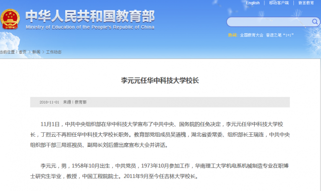 11月1日,中共中央组织部在华中科技大学宣布了中共中央、国务院的任免决定,李元元任华中科技大学校长,丁烈云不再担任华中科技大学校长职务。