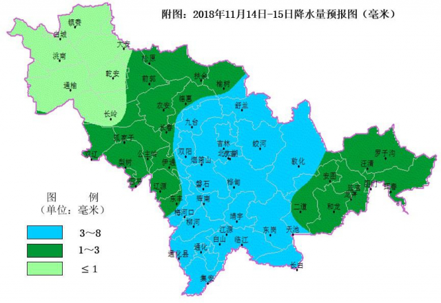 从吉林省气象局刚刚获悉:受高空槽影响,11 月 14 日夜间到 15 日夜间,我省自西向东将有一次雨夹雪转雪天气过程,降水主要集中在 15 日白天到夜间。其中长春东部、吉林、通化、白山、延边西部、长白山保护区有雨夹雪转中雪,部分地方有大雪,过程降水量为3~8 毫米,白城、松原西部有小雪,过程降水量不足 1 毫米, 其他地区有雨夹雪转小雪,过程降水量为 1~3 毫米。降水同时气温自西向东明显下降,中东部累计降温幅度可达 7~9℃,局部地方可达 11℃左右,将出现寒潮天气,其他地区累计降温幅度为 5~7℃,16 日早晨北部和东部山区最低温度为-14~-11℃,其他大部分地区为-10~-8℃。以下是14日夜间到15日夜间的详细降水量