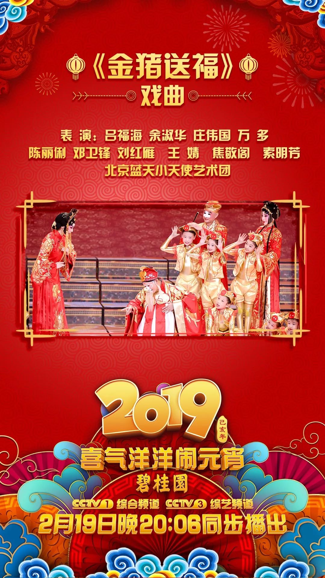 中央广播电视总台《2019年元宵晚会》将在元宵节2月19日当晚20:06 CCTV-1综合频道、CCTV-3综艺频道绚丽登场。整台晚会以“金猪闹春”为主题,“闹”与“乐”成为两大关键词,将围绕传统文化、艺术表演、联欢特色三大主线展开,陪伴全国观众共度元宵佳节。究竟有哪些艺术家和演员们在元宵节为全国电视观众送来这场视听盛宴呢?《2019年元宵晚会》嘉宾全阵容亮相!让我们先睹为快!