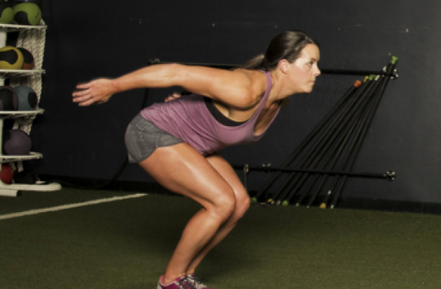 蓄势准备:双脚与肩等宽采用“运动员姿态”。然后摆动双臂,同时臀部和膝盖弯曲,在腿上加满能量。