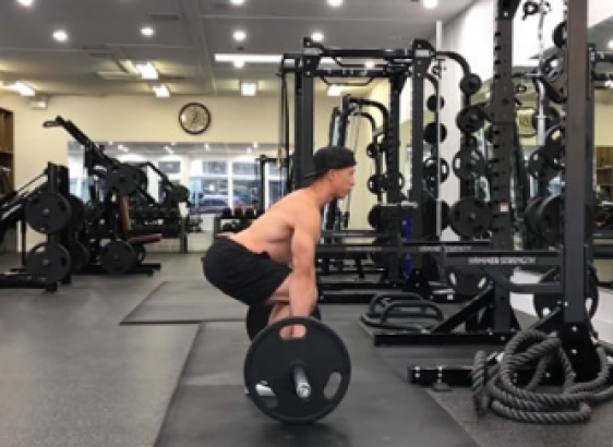 对于新手来说,我们可以先使用空杠铃杆来锻炼。我们双腿打开与肩同宽,然后俯身看双手能不能触碰到地板,可以的话我们就可以开始动作了。先将杠铃放在我们的身体前侧,然后我们俯身正握杠铃,将杠铃举起,直到我们的身体站直,然后我们可以再向上抬起一些杠铃,差不多到我们的臀部前侧位置。坚持这个动作5秒左右,我们再放回杠铃,这个过程中我们的双腿始终是直的。