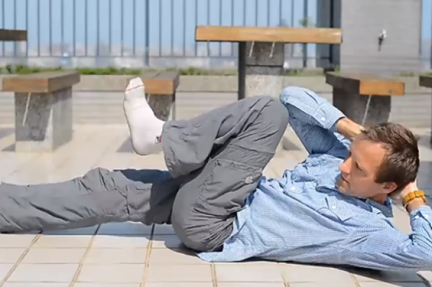 仰卧在地板上,下背部紧贴地面。双手放在头侧,手臂打开。将腿抬起,缓慢进行登自行车的动作。呼气,抬起上体,用右肘关节触碰左膝,保持姿势2秒钟,然后还原。再用左肘关节触碰右膝,同样保持2秒钟,然后慢慢回到开始姿势。