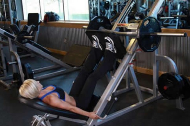 6. 测试出自己的最大腿举重量。练习重量在最大重量的80%~100%时,主要提高极限力量;练习重量在最大重量的60%~90%且动作速度较快时,主要提高爆发力;练习重量在最大重量的60%~80%时,主要增大肌肉体积;练习重量在最大重量的60%以下时,主要提高肌肉耐力。