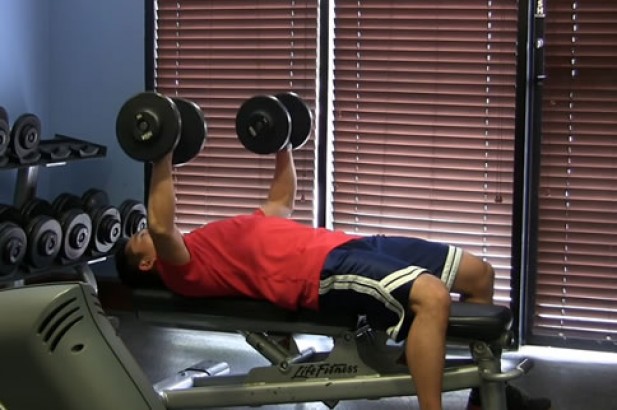仰卧飞鸟这项运动经常都是被大家利用来锻炼胸部肌肉的,而采用哑铃来帮助,就能够让这项运动在锻炼效果上更明显。做这项训练,先把身体仰卧在平面凳上,然后两只手拿着哑铃放在身体两边,并且慢慢地将哑铃提起来。提起哑铃的时候,两个手掌心是相对着的,并且我们在做这项训练的时候,其实是从身体两侧展开,然后再做飞鸟一样的运动,鸟儿在空中飞翔的时候都是两个翅膀在煽动的,我们就要用自己拿着哑铃的手臂进行模拟翅膀的运动。这个运动可以稍微慢一些,不用太快,这样比较不容易拉伤,我们的肌肉,并且在锻炼的时候也能够让胸肌充分的感受拉伸的感觉。