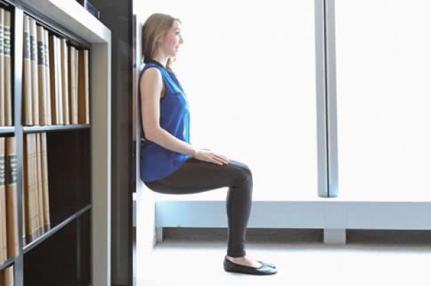 站在距离墙壁约40厘米的位置,背靠墙壁,双腿伸直,整个背部全部靠在墙壁上。将双手贴在墙壁进行支撑,如下图;缓慢的下滑,直到膝盖与地面呈30度角;保持该姿势10~15秒,然后回到初始位置。重复至少5-10次。
