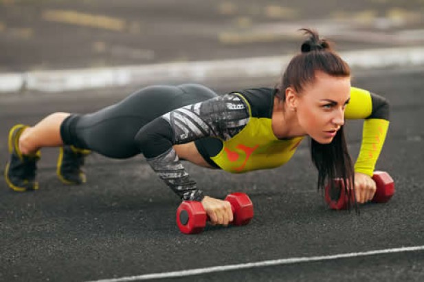 双手抓住一对肩宽分开的哑铃,将身体放低到地板,暂停完成。然后俯卧撑一旦你回到起始位置,将哑铃放在胸部的一侧,将其放回原处,然后在另一侧重复。