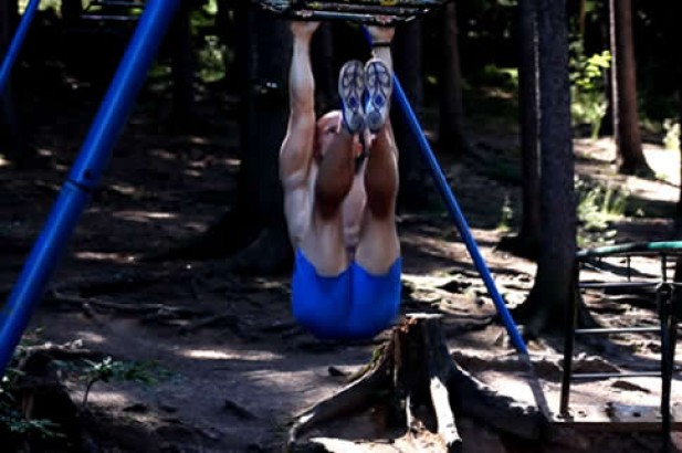 3. 胳膊伸直,背部发力,保持身体稳定。背部发力紧密连接整个上半身,让身体进一步的稳定防止摇晃。确保在你举腿的时候胳膊肘不会弯,如果产生肘屈,会分散力量并且打破身体稳定。很多人在锻炼的时候都没有意识到这一点,胳膊肘在整个动作流程中都必须锁定,这样才能更好的孤立刺激腹肌!