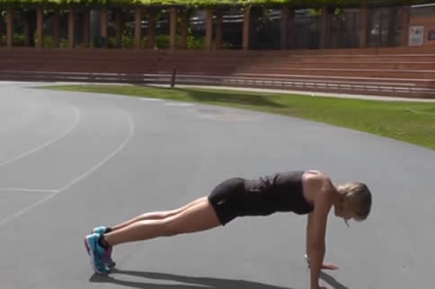 2. 将双腿甩到身体后侧,让身体呈现俯卧撑姿态(可以在这里增加一下动作难度,做一个标准的俯卧撑动作)。