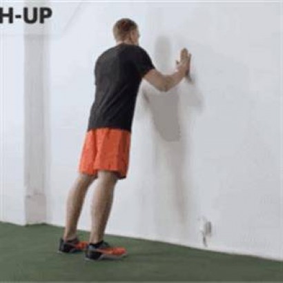 2. 面向墙面一步的距离,双手向前伸直,双手按实墙面,双臂平行于地面。