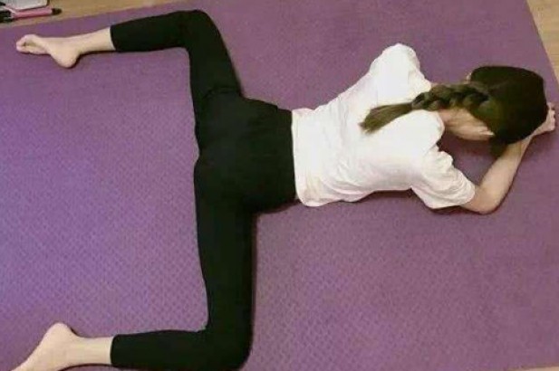 青蛙趴,大腿要与身体成90度直角,小腿与大腿成90度直角。耻骨处尽量贴到地面。刚开始的时候比较痛苦,贴不上去的,不要硬来。慢慢的就好了。
