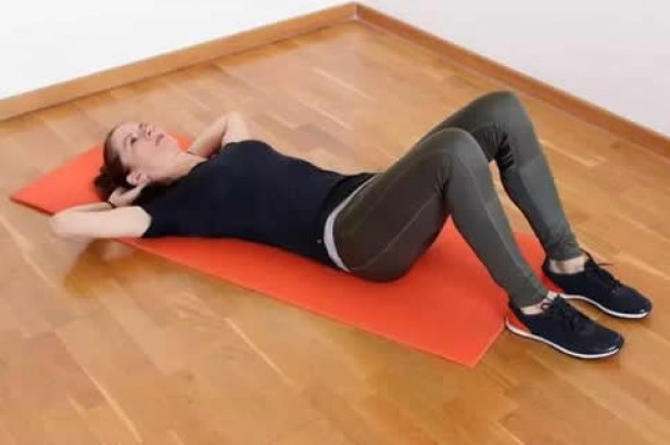 仰卧,双腿交叉屈膝呈90度,上半身抬离地面预备。肚子收紧,上半身保持微离地面,双腿往身体收回。 回到原来姿势,重复动作,左一分钟。