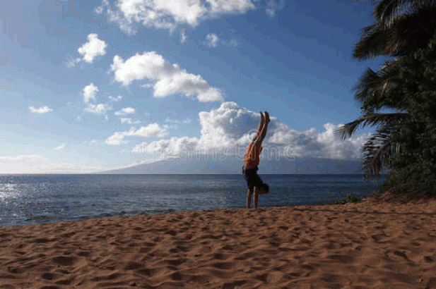 找一面墙,双手手掌平放在距离墙根约15一25厘米的地面上,双手与肩同宽。双膝曲,蹬起靠墙成倒立姿势。