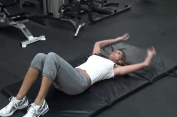 仰卧,双腿交叉屈膝呈90度,上半身抬离地面预备。肚子收紧,上半身保持微离地面,双腿往身体收回。 回到原来姿势,重复动作,左一分钟。