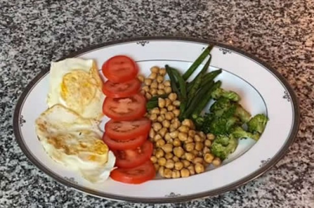 第1餐:4个鸡蛋,3个蛋清,1杯西兰花,1汤匙橄榄油,1/4杯乳酪