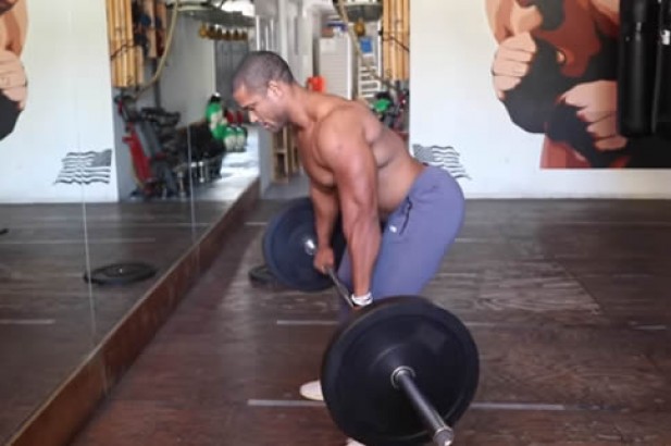 2. 收缩背部肌肉,以划船的轨迹将杠铃提起,同时呼气。注意肘部紧贴身体两侧。