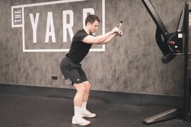 2. 直臂拉至身体两侧,夹紧肩胛骨,稍停顿后还原。