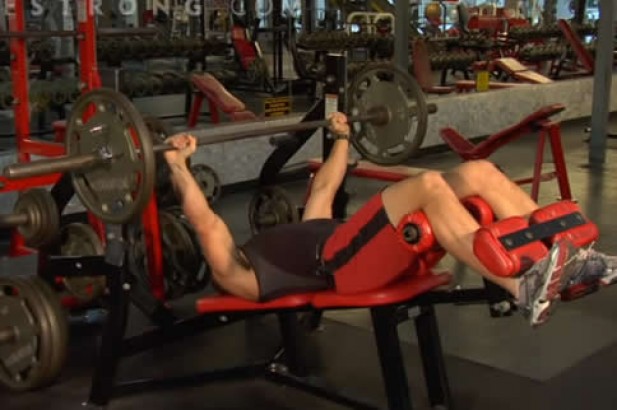 仰卧在可调节斜度的长凳上,头部处于低位,使躯干与地面呈15度~20度,杠铃应垂直向上推起至杠铃处于肩关节的垂直线上,使胸大肌处于“顶峰收缩”位,稍停。