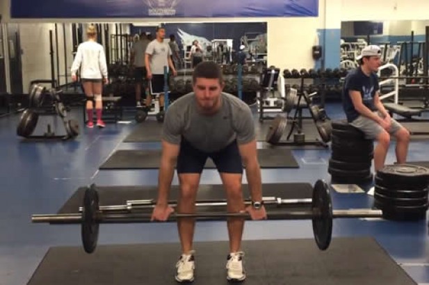 3. 下放杠铃过程中,背部保持平直,杠铃下放得越底,臀部要慢慢向后移动,以保持杠铃在过程中始终贴紧身体。