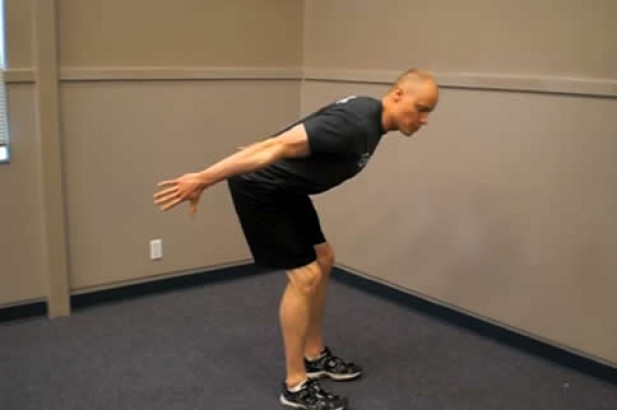1. 双脚与肩同宽,站好,双膝微屈,同时上半身前倾,大约与地面呈45度,双臂自然后摆,呈半蹲姿势。